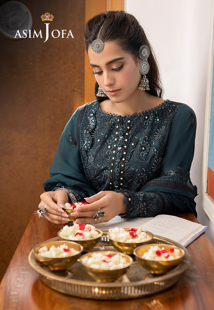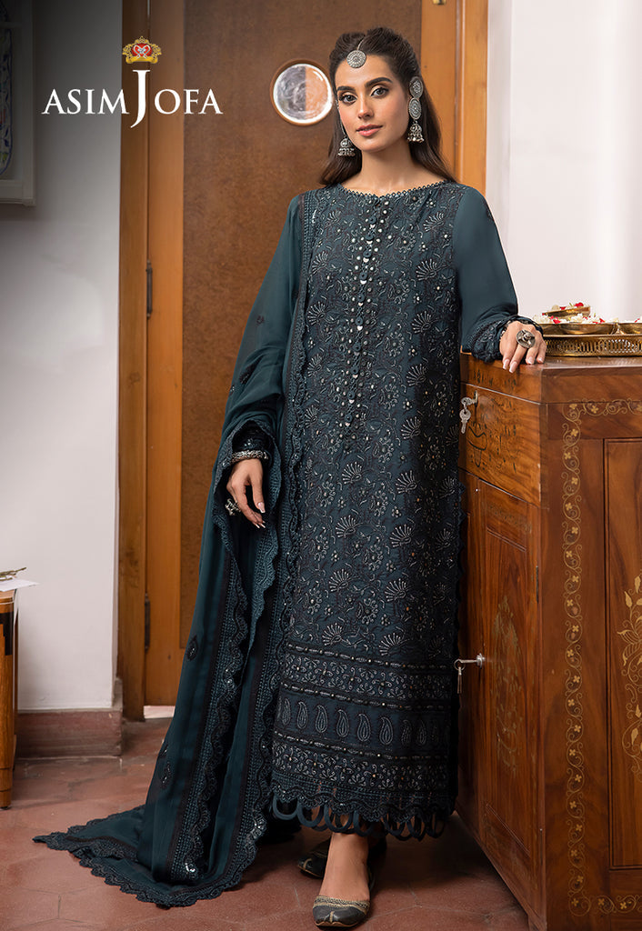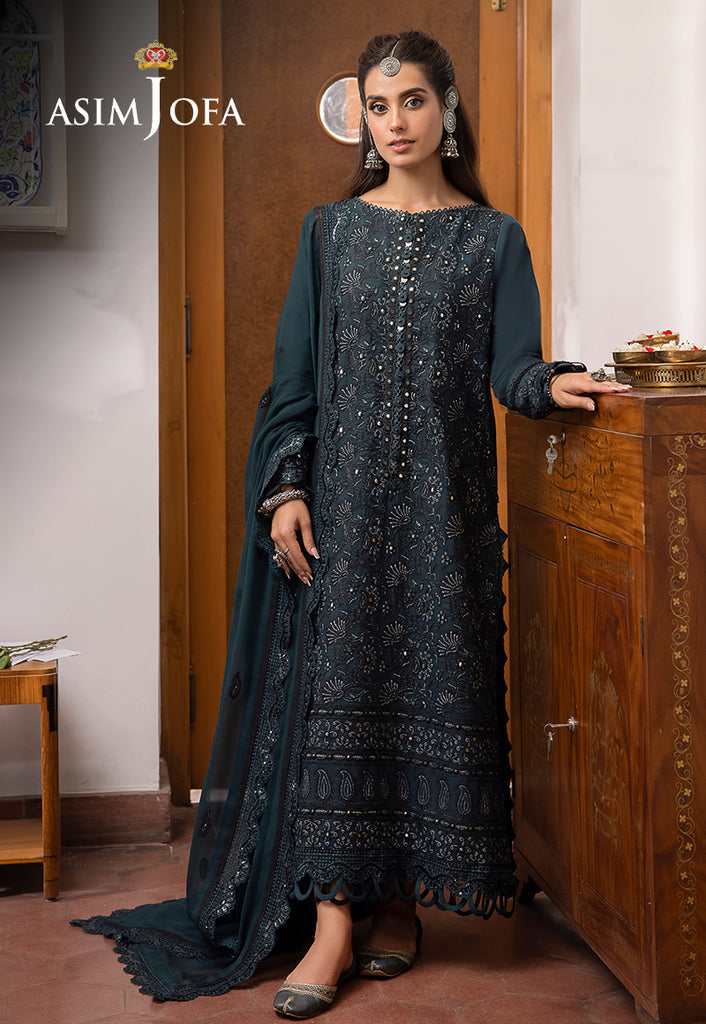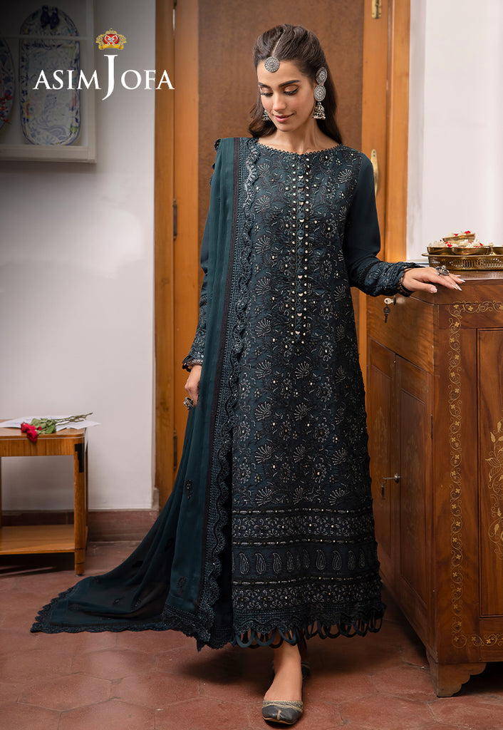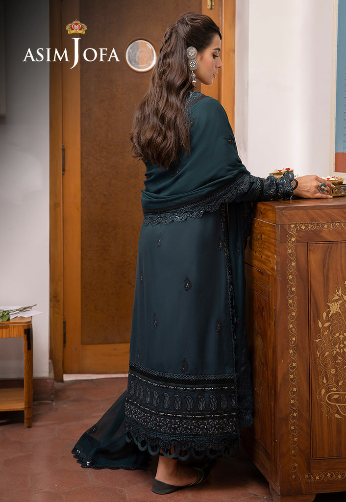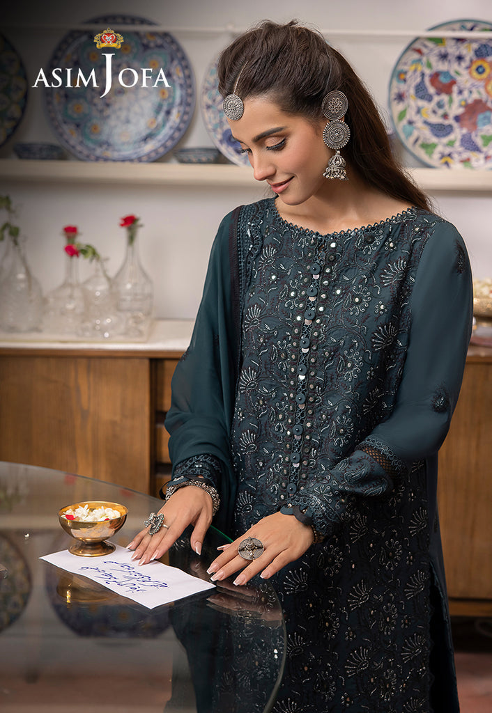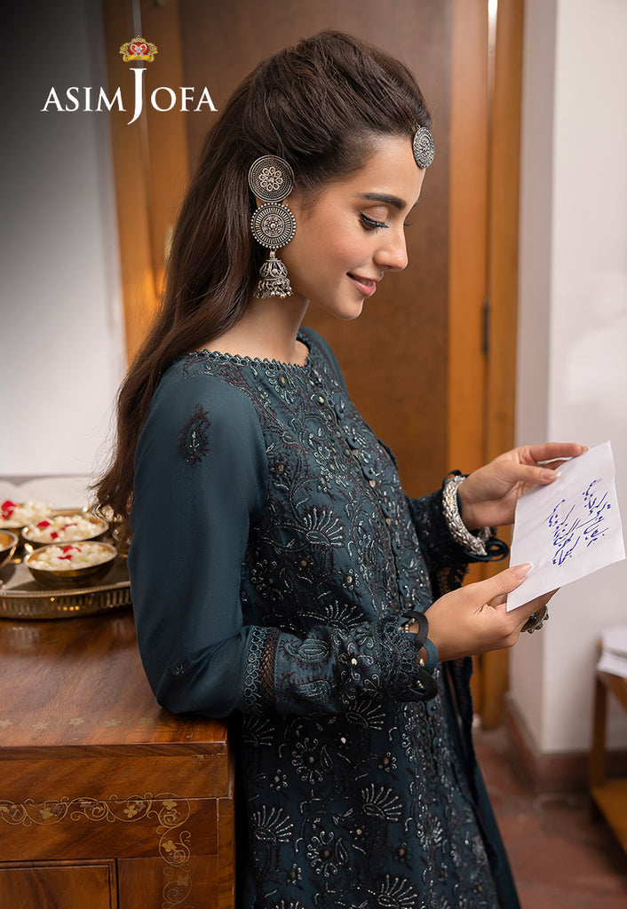 In the evocative narrative of Asim Jofa's "Shadow Work" collection, model Iqra Aziz becomes the vessel through which a story of elegance and allure is told. This ensemble is a journey of contrasts, where silver zari and black threadwork coalesce like a melodic duet. Each embroidered detail is a chord of emotions struck, a composition of unspoken truths. The 9mm sequins are like notes of music suspended in the air, their gentle sparkle infusing the fabric with a rhythm of enchantment. The neckline stands as the opening note of a sonata—a promise of the harmonious beauty that follows. Amidst this musical composition, the floral baroque motifs and paisley elements are like verses of an age-old ballad, revived for the modern stage with elegance and flair.