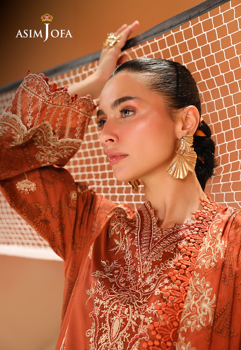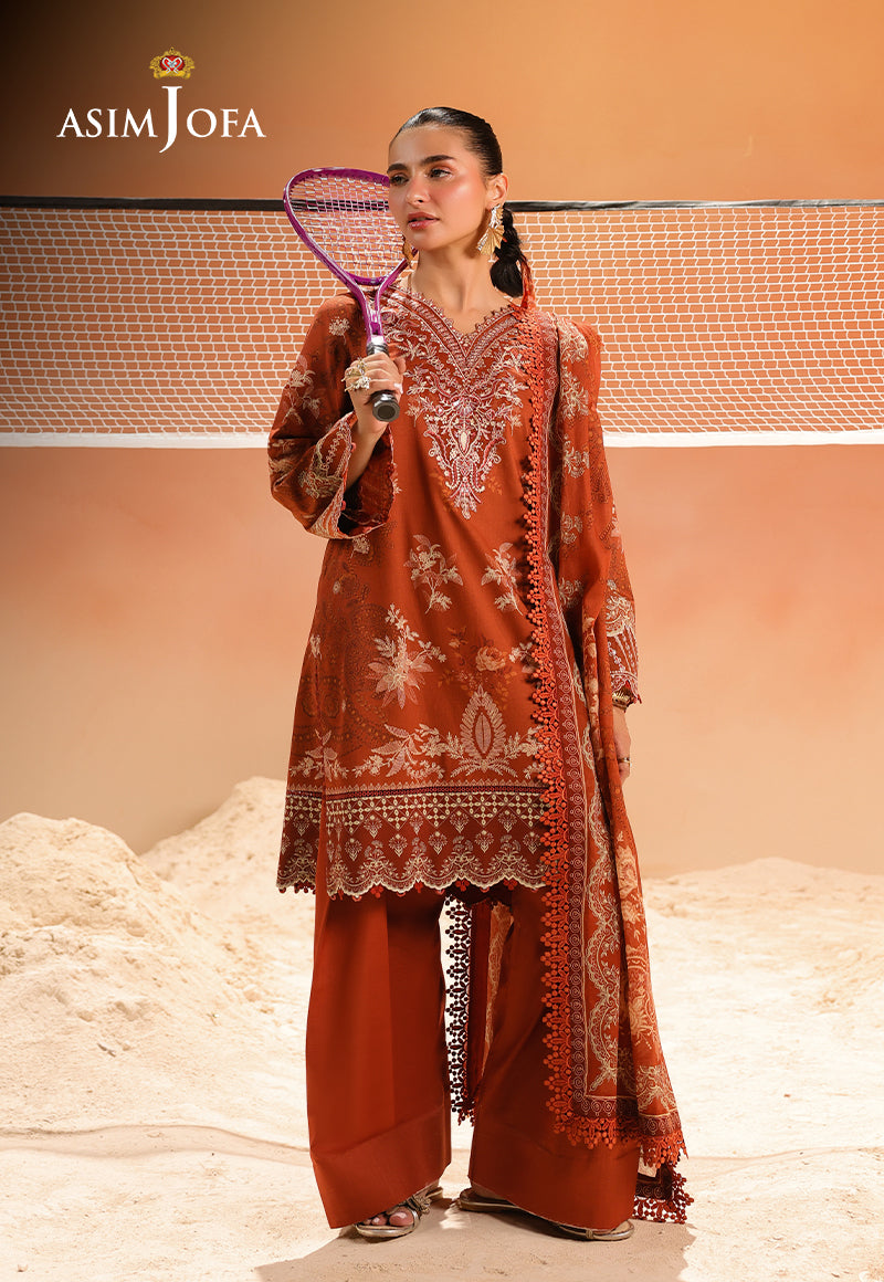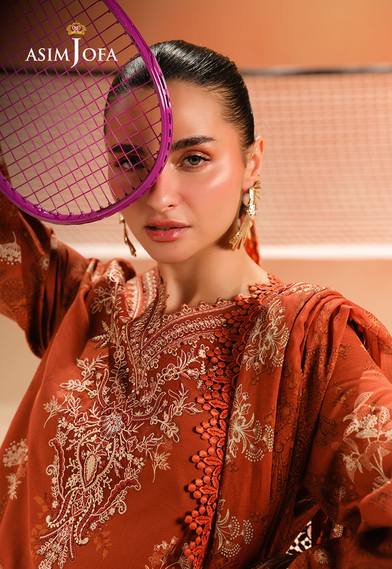 Minimalism meets poetry in this rust-hued vision. The clean yet captivating print forms a backdrop for delicate embroidery on the neckline and sleeves—like sunlight filtering through autumn leaves. A printed dupatta adds a soft finish to this artistic expression.