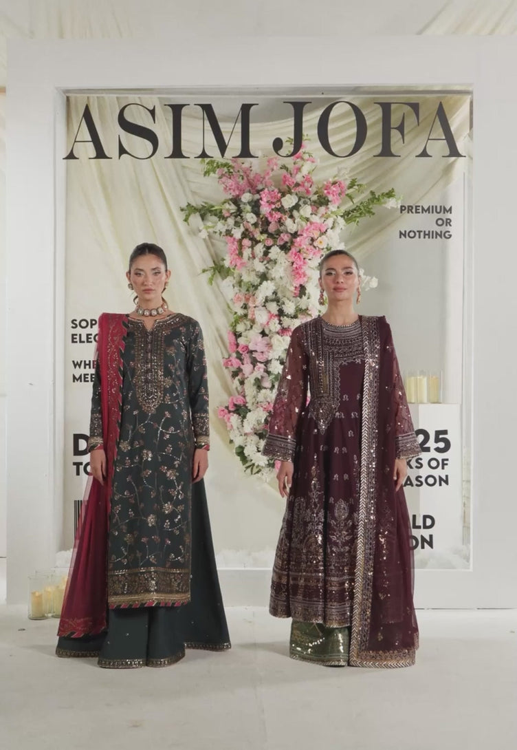 Lush and luminous, this dark green ensemble channels the elegance of a midnight garden. The shirt is intricately embroidered in a foliage-inspired pattern, where maroon and pink threadwork intertwines with glistening gold zari and sequins, creating a rich tapestry of texture and tone. Complemented by embroidered trousers and a softly contrasting salmon dupatta with minimal detailing, this look is quiet luxury at its finest, earthy, enchanting, and effortlessly poised.