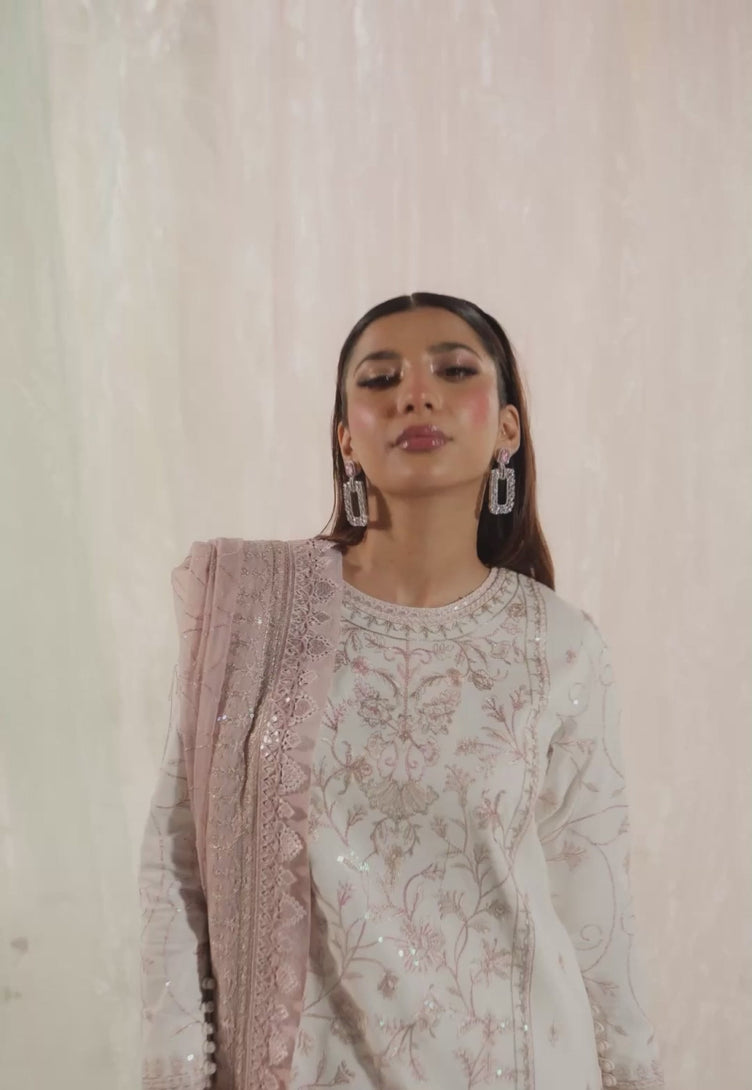 Delicate and dreamlike, this cream ensemble is a portrait of serene elegance. The shirt features soft pastel embroidery in powder pink threadwork, kissed with multihued transparent sequins that catch the light like morning dew. Paired with a contrasting tea pink dupatta adorned with an intricate all-over jaal, this look is a gentle whisper of sophistication—perfect for the woman who embraces grace in every gesture.