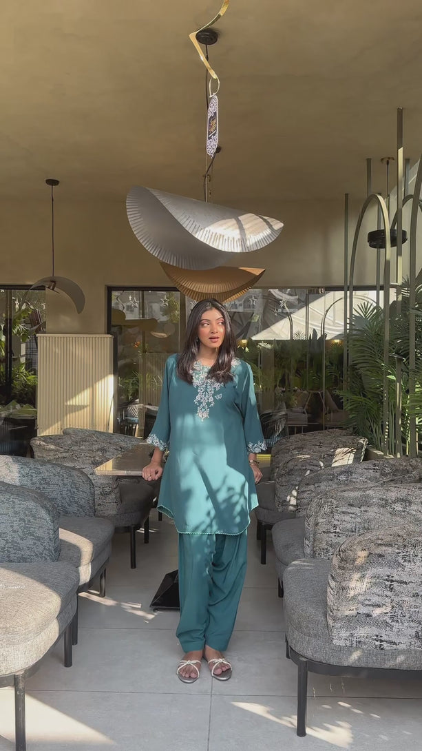 This 2 pc teal linen set features a shirt with an embroidered neckline and embroidered sleeves with a sleek round daman paired with a skinny shalwar. The perfect breezy outfit for your lunch dates or dinners.